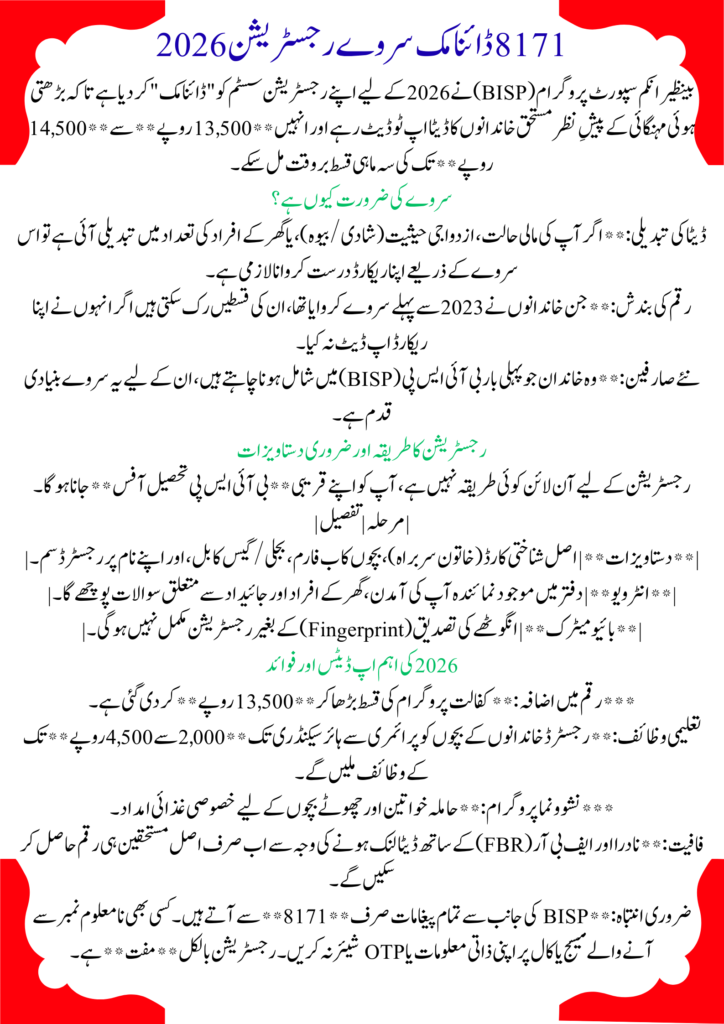 The 8171 Dynamic Survey Registration 2026 is essential for continuing financial assistance under BISP. If your status shows “Survey Required,” do not delay. Visit your nearest Tehsil office with complete documents and complete biometric verification.