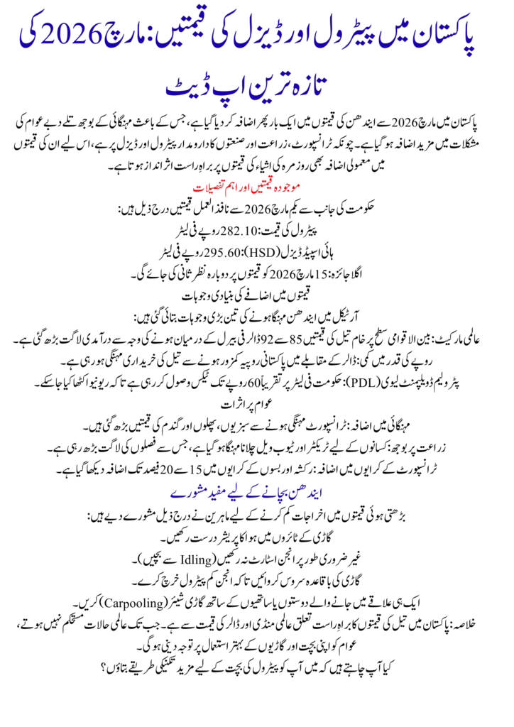 Fuel prices in Pakistan have increased again in March 2026, creating financial pressure for millions of people across the country. Petrol and diesel are essential for transportation, agriculture, and industries, so any increase in fuel prices directly affects the daily budget of Pakistani families. From motorbikes and cars to buses, trucks, and tractors, almost every vehicle depends on petrol or diesel. When fuel prices rise, transportation costs increase and the prices of vegetables, food, and other goods also go up. This is why the latest increase in petrol and diesel prices has become a major concern for the public.